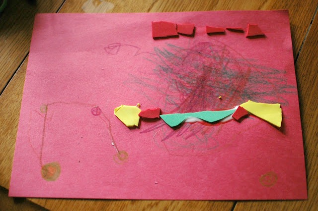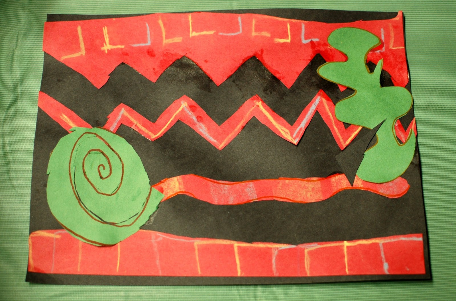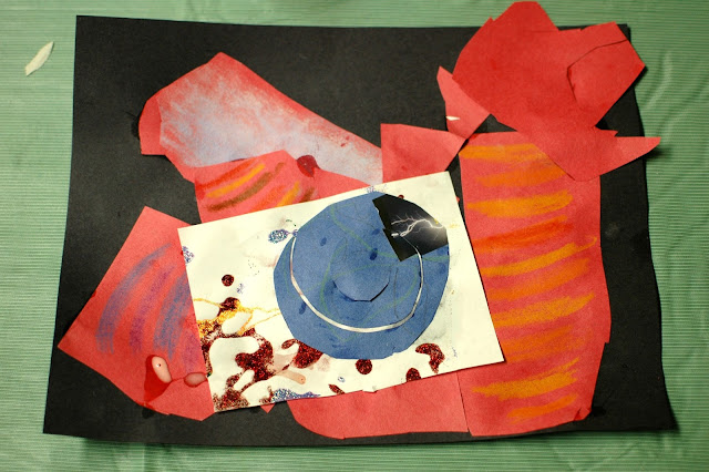 For the Preschool group, we also reviewed what a pattern is and talked about the patterns in Matisse's artwork. We encouraged them to create a pattern using beeswax crayons on a piece of construction paper. We then reviewed what a shape is, asking them which ones they knew (circle, square, etc.) and pointing out again which ones are in Matisse's artwork (starburst, splash, spirals, zigzags, wavy lines). They then cut out their own shapes and glued them onto the patterned paper. One child decided to make a three-dimensional spiral, which I thought was fabulous!