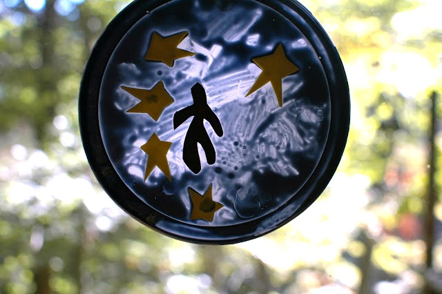 The last thing we created was a plastic lid sun catcher based on Matisse's "Icarus" (1947). We've made plastic lid suncatchers before using glue & paint. While they turned out fine, I've figured out a method with richer color and fuller coverage. We use a Martha Stewart Multi-Surface Paint as a base, then tint it with a little bit of another acrylic color. The Multi-Surface Paint binds wonderfully with the lid, and we haven't had any flaking or cracking.