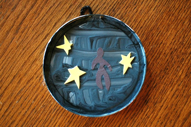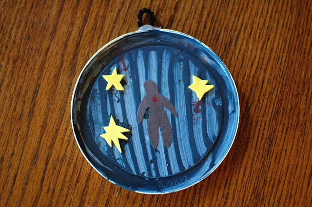 While the paint was still wet, the children stuck on foam stars and a little figure that I had already prepared. Once they were dry, we added the smidge of red with Prismacolors (acrylic paint would work too) and hot-glued on a pipe-cleaner loop for hanging.